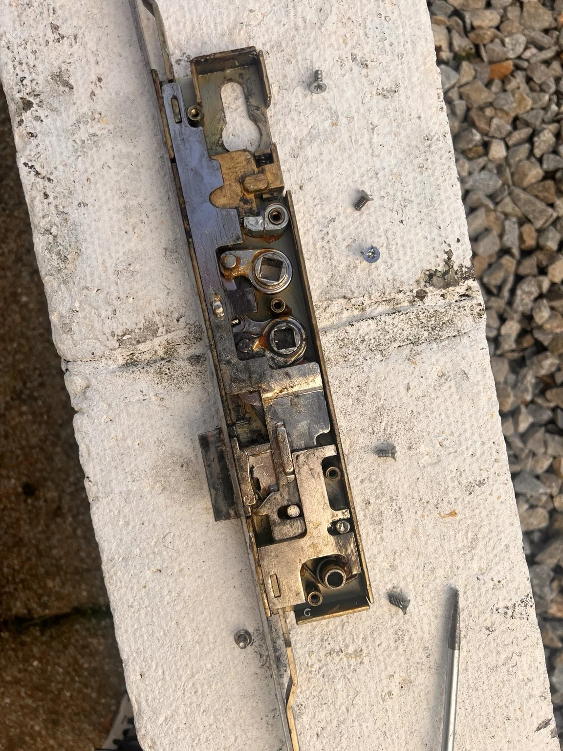 Example of a failed multipoint locking mechanism removed and replaced during a door lock repair.
